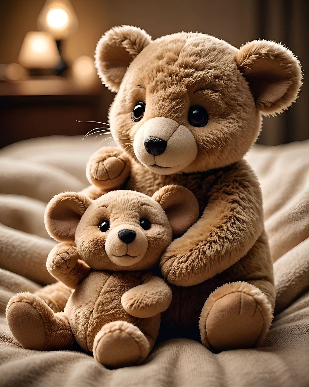 A teddy bear is a soft, stuffed toy bear, typically made of plush fabric, with a friendly appearance and often designed to resemble a real bear cub. They usually have round bodies, soft fur, and cute, often smiling faces.